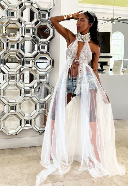 The TM Pearl-dream maxi-vest features a stunning white pearl and soft tool material that can be easily layered over any outfit, catering to all sizes.