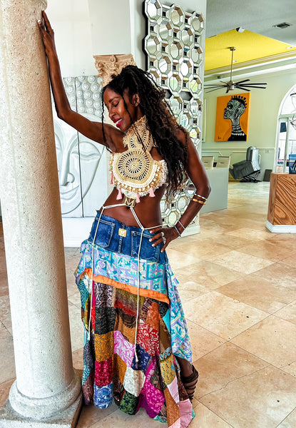 Get ready to turn heads with the TM Silk Patch Colorful Skirt! Made of sustainable silk and a unique patch design with assorted colors - never two exactly alike. This skirt will make you stand out from the crowd. Complete with a stylish TM denim band at the waist, this skirt is the perfect blend of comfort and style. Step out in confidence and show off your personality with this one-of-a-kind skirt!