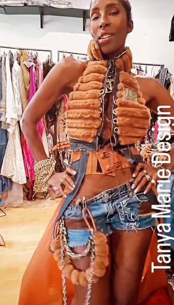 Turn heads effortlessly in the TM Fur/Denim 2pc set, featuring a stylish attachable chain that adds a bold, edgy touch. This playful duo blends cozy fur with classic denim for a look that's both fun and fashion-forward—perfect for standing out wherever you go.